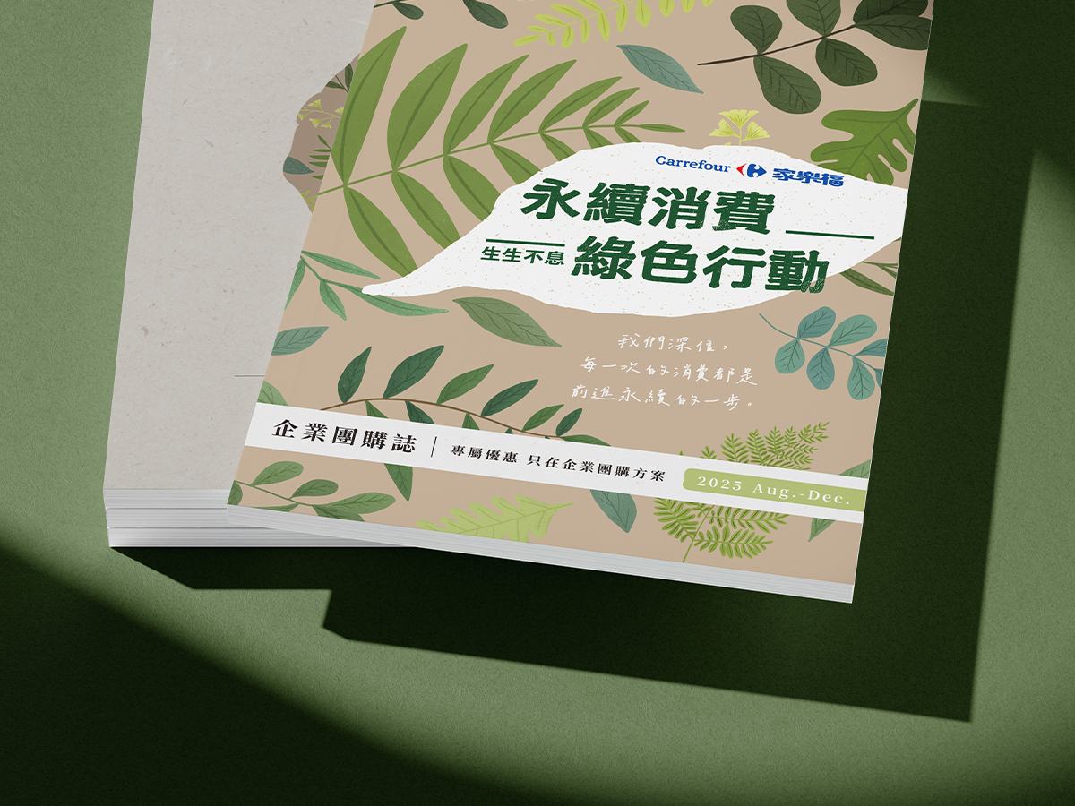 MX 協助家樂福進行企業團購誌設計,以「永續消費」為主軸,設計清爽乾淨的DM視覺。透過不同icon劃分企業和產品分類,讓閱讀動線清楚易理解。